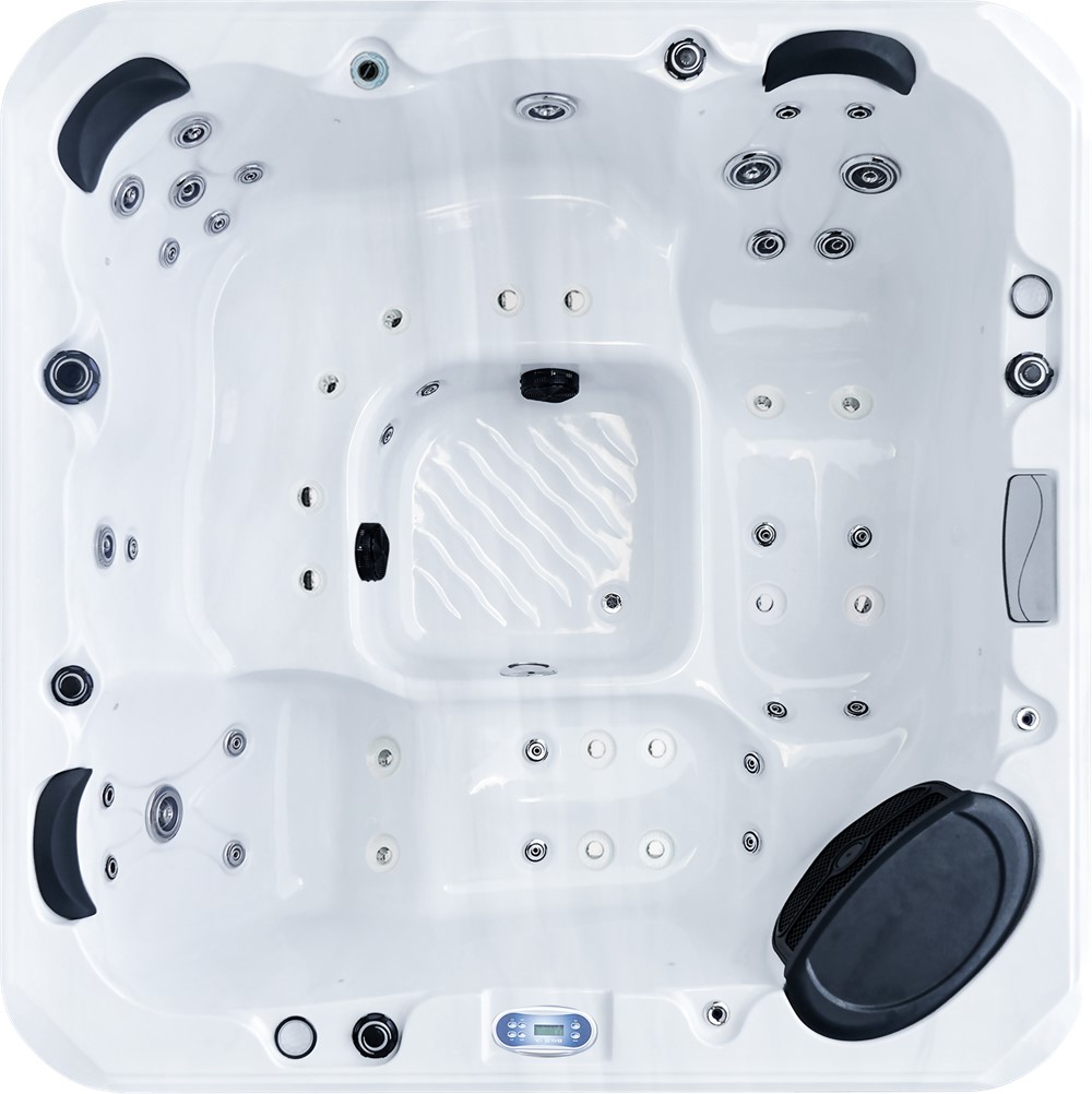 Mit 46 Massagedüsen, darunter 16 Champagnerdüsen, bietet er ein intensives Massageerlebnis auf zwei Liegeplätzen und drei Sitzplätzen. Die Unterwasserbeleuchtung und stimmungsvolle LED-Lichterketten schaffen ein harmonisches Ambiente, während drei beleuchtete Wasserfälle für zusätzliche Entspannung sorgen.