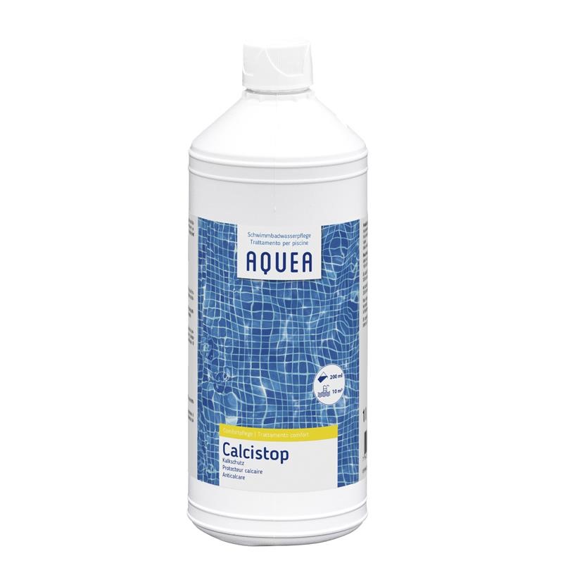 Aquea Calcistop verhindert Kalkausfällungen und Verfärbungen durch Metallionen. Verhindert Kalkausfällungen und Ablagerungen im Becken, schützt Pumpen und verlängert deren Lebensdauer. Stabilisiert Metallionen im Beckenwasser und verhindert somit die Fleckenbildung.